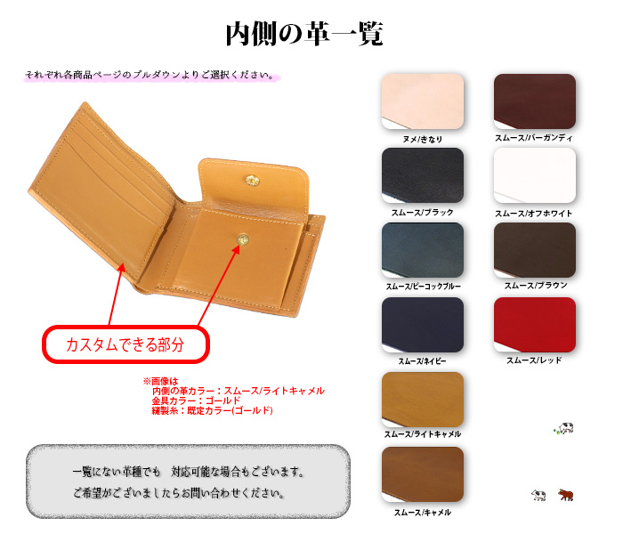 | 【内側の革のカラーをお選びください】 | スムース/ブラック, シュリンク/シボ小 ブラック, スムース/ピーコックブルー, スムース/ネイビー, スムース/ライトキャメル, スムース/キャメル, スムース/バーガンディ, スムース/オフホワイト, スムース/ブラウン, スムース/レッド |