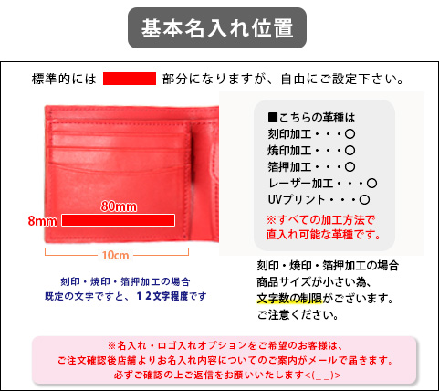 | 【名入れ加工について】 | 名入れなし, 刻印加工★英数字のみ★, 刻印加工★オリジナル刻印希望★, 焼印加工★英数字のみ★, 焼印加工★オリジナル刻印希望★, 箔押加工/金色★英数字のみ★, 箔押加工/金色★オリジナル刻印希望★, 箔押加工/銀色★英数字のみ★, 箔押加工/銀色★オリジナル刻印希望★, UVプリント加工, UVプリント加工【データ入稿希望】, レーザー加工, レーザー加工【データ入稿希望】, レーザー加工(革色ホワイトのみ不可) |